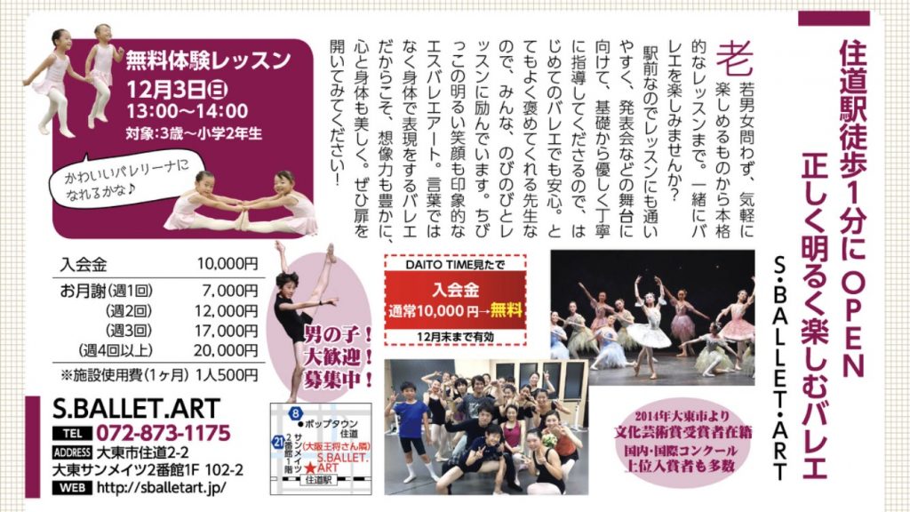 S.BALLET.ART で一緒にバレエを楽しみませんか? 『DAITO TIME』11月号に無料体験レッスンのご案内などを掲載いただきました 是非、この機会にスタジオへ足をお運びください☆